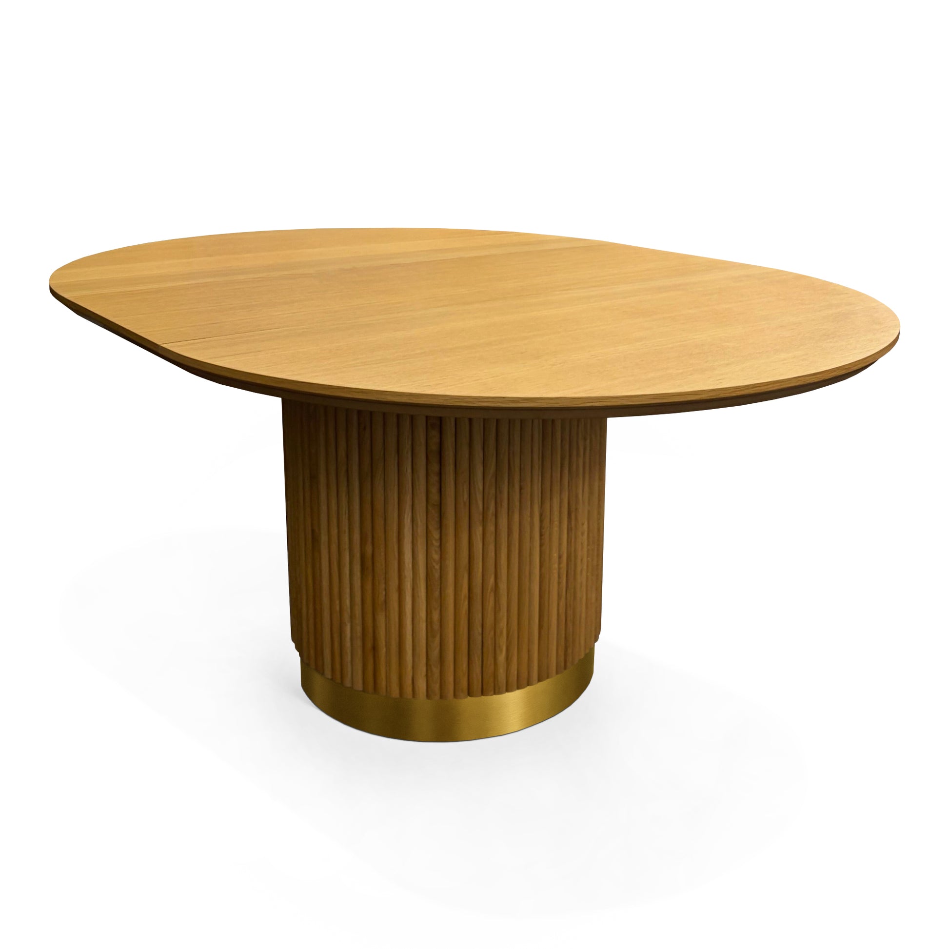 Die Tischplatte ist entweder in massivem Eichenholz oder Eichenfurnier erhältlich. Das Bein besteht aus Sperrholz und Lamellen aus massivem Eichenholz.