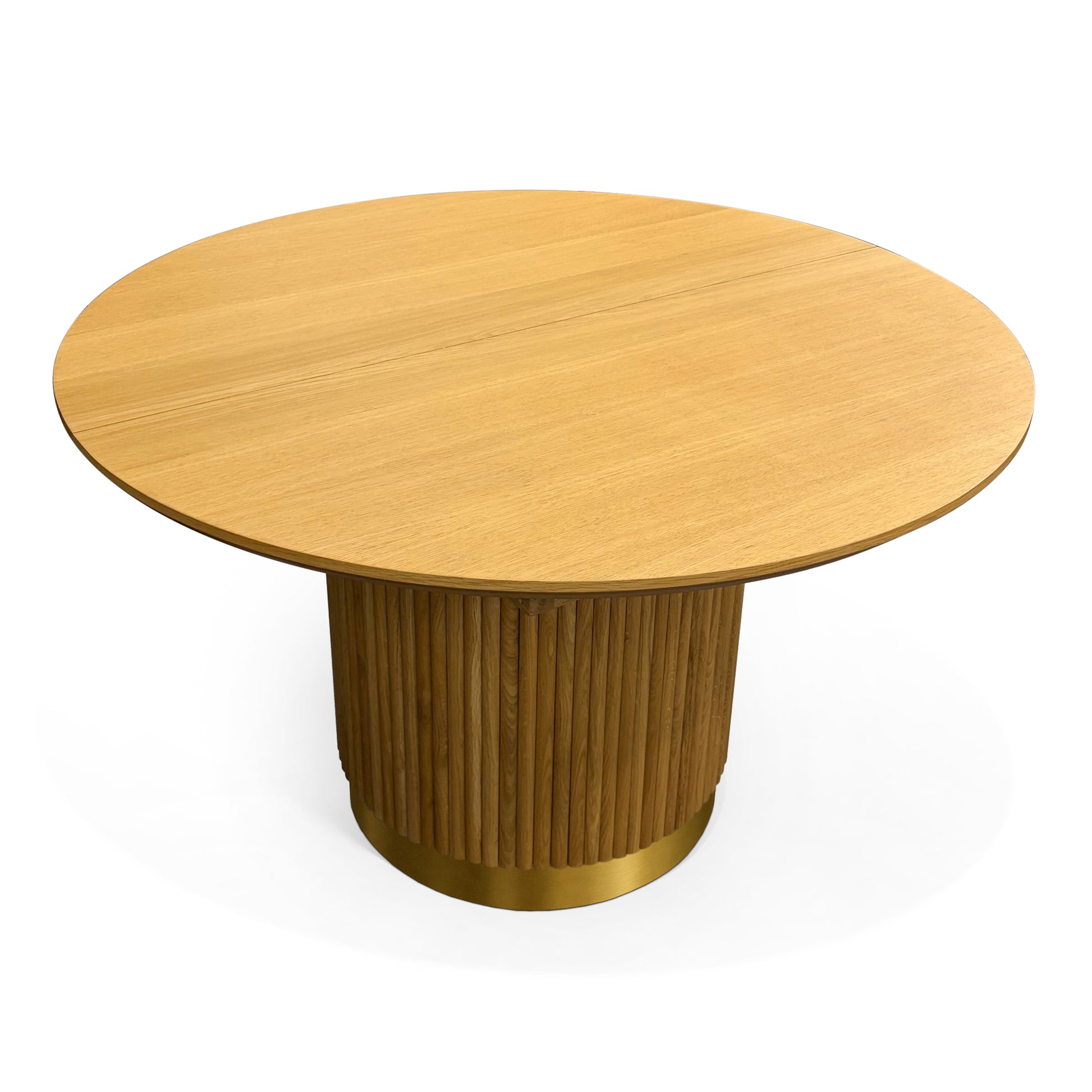Dieser runde Tisch verfügt über eine Tischplatte aus Massivholz oder gebeiztem Eichenfurnier. Der beschwerte Sockel ist mit vertikal ausgerichteten, gebeizten Eichenpaneelen ausgestattet.